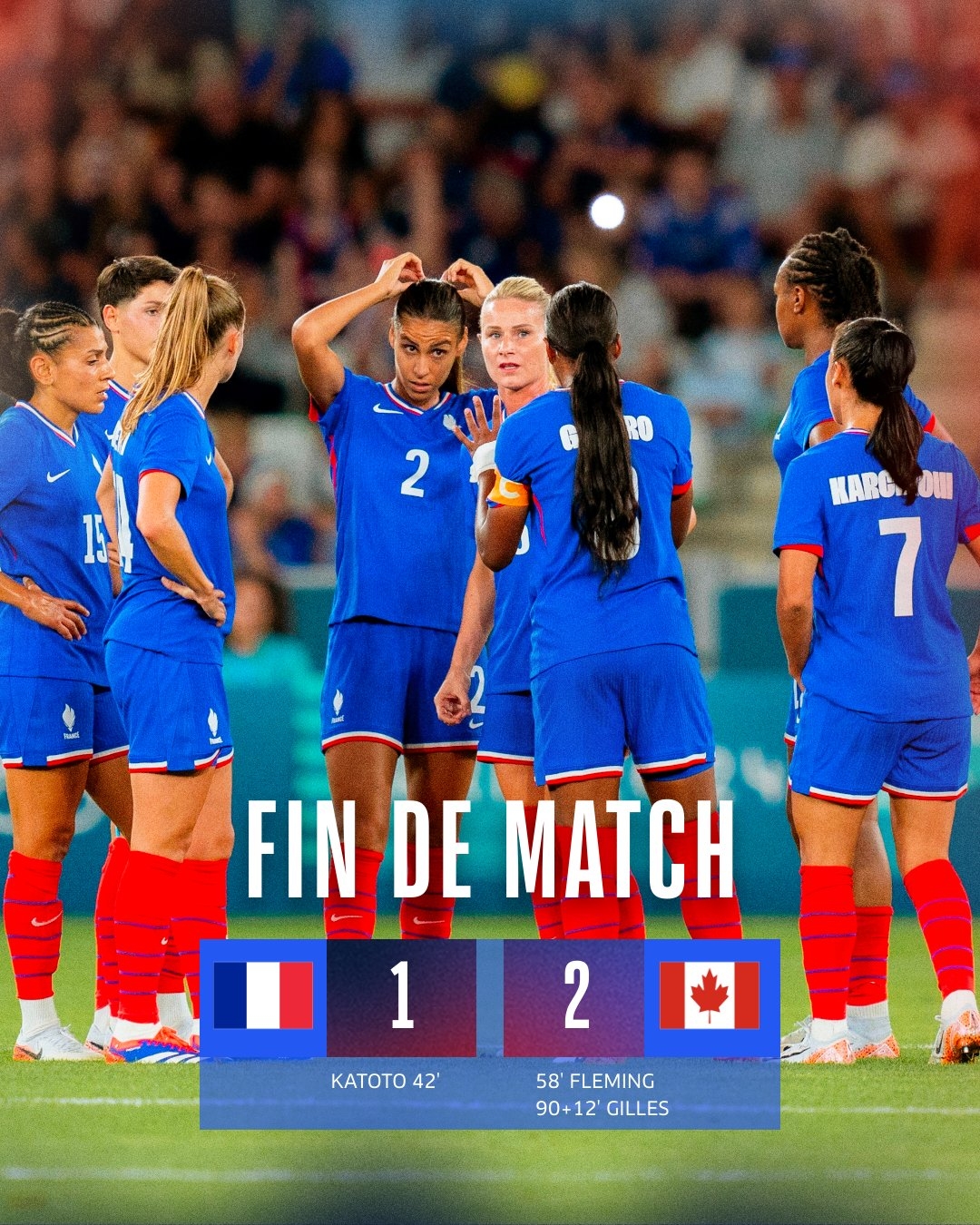 卡托托在第42分钟领先法国,杰西·弗莱明在58分钟内扳平了加拿大,吉尔斯在102分钟内获胜。