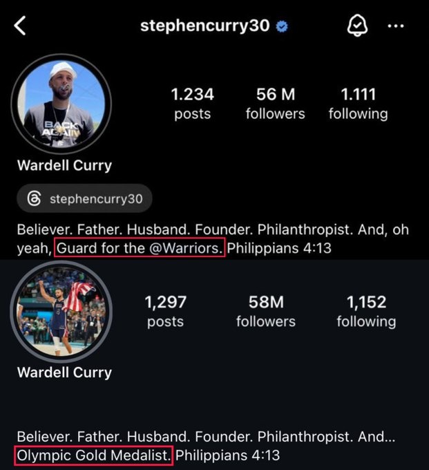 最近,库里在社交媒体Instagram上修改了自己的介绍,并将“勇士后卫”改为“奥运金牌得主”。