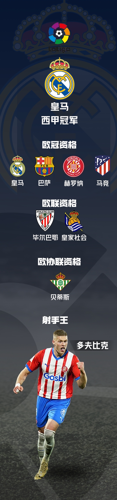 5月27日讯 西甲23/24赛季结束,皇马夺冠,巴塞罗那第二,赫罗纳第三,马德里竞技第四,多夫比克获得西甲金靴奖,巴埃纳获得助攻王。