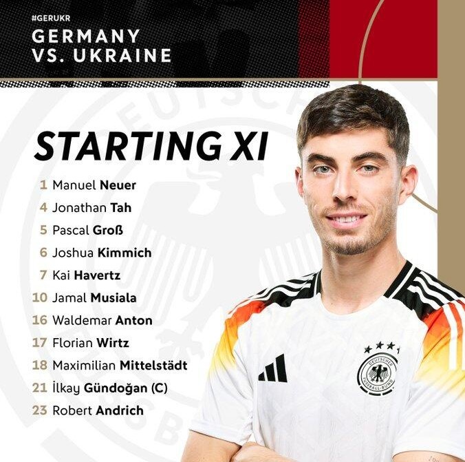 德国VS乌克兰首发:哈弗茨、穆西亚拉、维尔茨出战