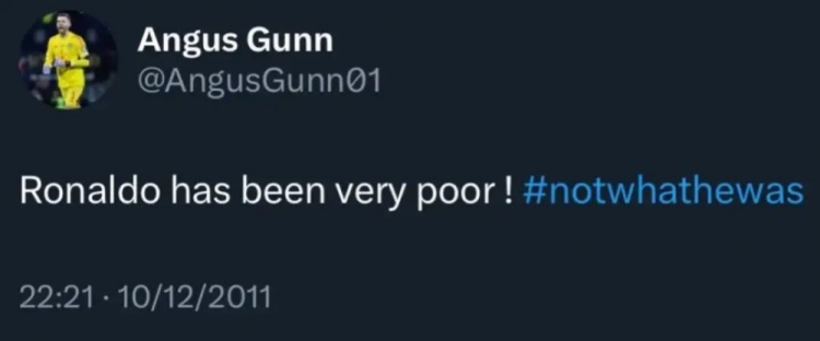 9月10日讯 据进球网报道,苏格兰门将安古斯·冈恩在15岁时在推特上发帖称罗纳尔多退役,但几天前,他被39岁的罗纳尔多攻破,赛后被嘲笑并删除。